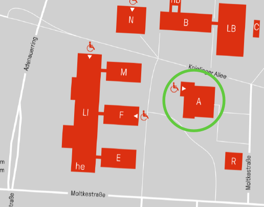 Das Gebäude A und die Aula der Hochschule Karlsruhe erreichen Sie entweder mit dem Auto oder auch per ÖPNV, mit anschließendem kurzen Fußweg. Den nächstgelegenen großen Parkplatz mit ausreichend Parkplätzen finden Sie hier hinter dem Gebäude B.